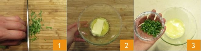To prepare the butter and sardine toast, first chop the parsley 1, melt the butter in a small bowl 2, just enough to create a creamy texture, and add the chopped parsley 3.