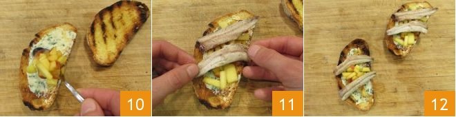 Place a spoonful of peach cubes on top and finish with the sardine fillets 11. The butter and sardine toasts are ready to be enjoyed 12!