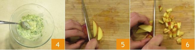 and mix well 4. Set aside the butter sauce and work with the peach: wash it, divide it in half, remove the pit, then slice it 5 and cut the slices into cubes 6. Collect them in a bowl.