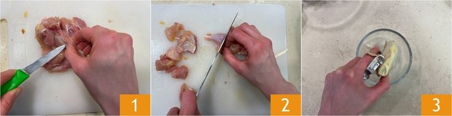 To prepare the butter chicken, first take the thighs and debone them 1, then cut them into pieces 2. Peel the ginger 3 and peel the garlic cloves.