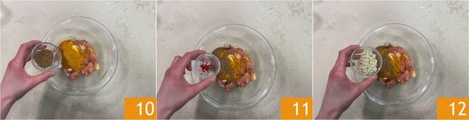 Season with garam masala 10, chopped hot chili 11, and the garlic and ginger paste 12.