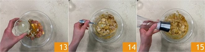 Add the lemon juice 13 and mix well 14. Finally, add salt 25 and mix again.