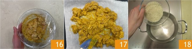 Cover with plastic wrap 16 and refrigerate for at least 30 minutes or up to 24 hours. After this time, preheat the oven to 392°F. Arrange the chicken with its marinade on a baking sheet lined with parchment paper 17 and bake for about 30 minutes, until golden. In the meantime, cook the basmati rice in boiling water 18 and prepare the sauce.