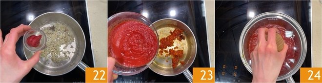 Add the tomato paste 22 and stir. Then add the tomato puree 23 and adjust with salt. If you prefer, you can also add a pinch of sugar. Cover with a lid 24 and simmer over low heat for about 20 minutes, until the sauce thickens.