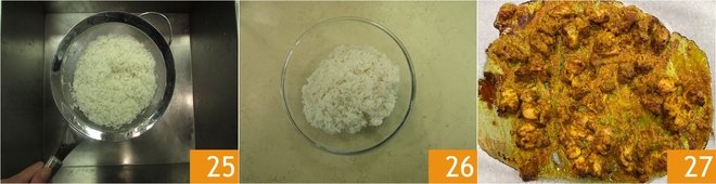 Once the rice is cooked, drain it 25 and set aside in a bowl 26. At this point, the chicken will be cooked, so take it out of the oven 27.