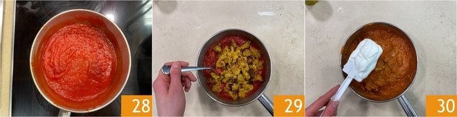 The sauce will also be ready 28, remove the whole spices and add the chicken inside 29. Continue cooking over low heat for another 10 minutes, then add the sour cream gradually, off the heat 30.