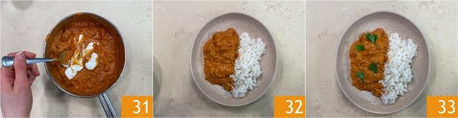 Mix to obtain a creamy consistency 31. Plate the dish by serving the rice with the chicken alongside it 32, and garnish with parsley leaves. Enjoy the butter chicken piping hot! 33!