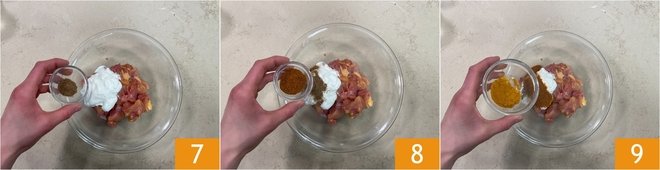 Add the cumin 7, sweet chili powder 8, and turmeric 9.