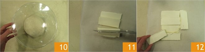 Transfer it to a large bowl and cover with plastic wrap 10. Let the dough "rest" at room temperature for a couple of hours. After the maturation time at room temperature, transfer the dough to the refrigerator for 12 hours. Meanwhile, prepare the margarine. Cut it into 6 slices, then arrange them on a sheet of parchment paper, trying to form a square 12.