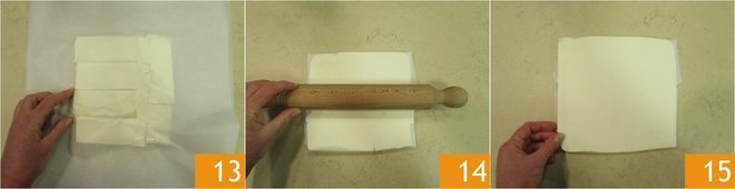Place another sheet of parchment paper on top 13 and use a rolling pin to even out the margarine 14 to form a square block 7 inches by 7 inches, half an inch thick 15. Then store it in the refrigerator until use.
