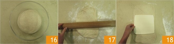 After the 12 hours of maturation in the refrigerator, take the dough and leave it at room temperature for 2 hours 16. At this point, roll it out on a lightly floured work surface until you get a rectangle measuring 14 inches by 8 inches 17. Place the margarine square in the center of the dough 18.