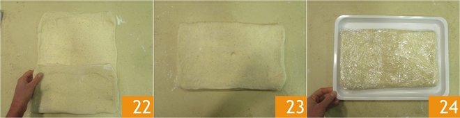 Give the dough the first three-fold by bringing the lower flap to the center 22 and covering it with the upper flap 23. Cover the obtained block with plastic wrap, transfer it onto a tray 24, and let it rest in the refrigerator for 30 minutes.