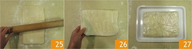 Roll out the dough again on the lightly floured work surface 25 (always until you get a rectangle measuring 20 inches by 10 inches) and give it the second three-fold, as just done 26. Cover the block again with plastic wrap and let it rest for another 30 minutes in the refrigerator 27.