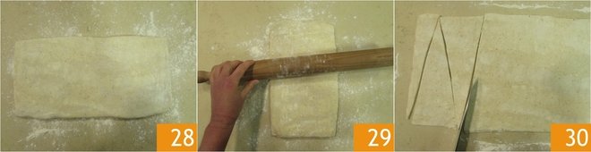 After resting in the refrigerator, repeat the operation for the third and final three-fold 28. Cover the dough again with plastic wrap and let it rest in the refrigerator for 30 minutes. Then take it out and roll it out on a floured work surface 29 to obtain this time a rectangle measuring 24 inches by 10 inches. With the help of a sharp knife, make triangles with a base of 4 inches 30.
