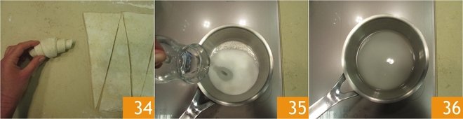 so that the closure part ends at the bottom 34. Transfer them onto a baking sheet and let them rise for 2 hours at a temperature of about 77°F. Meanwhile, prepare the syrup: pour water and sugar into a saucepan 35, bring to a boil for a couple of minutes 36. Then turn off the heat and let cool.