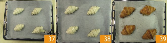 After the rising time, gently brush the surface of the croissants with the obtained syrup 37 38. Bake in a static preheated oven at 375°F for 25 minutes. Remove from the oven and let cool before serving 39!