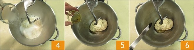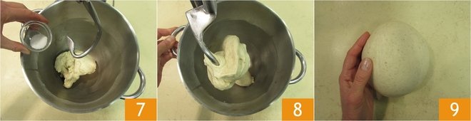 Finally, add the salt 7. Work all the ingredients with the hook until you get a smooth, homogeneous, and well-bound dough 8. Transfer the obtained dough onto the work surface and quickly round it into a spherical shape 9.
