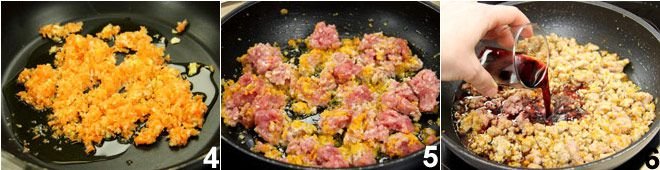 Meanwhile, put 3 tablespoons of extra virgin olive oil in a pan and add the chopped celery, carrot, and onion 4, letting them brown over low heat. Then add the crumbled sausage and minced meat 5. Sauté the meat, trying to make it finer using a spoon to break it up while cooking. When the meat is well-browned, deglaze with the glass of wine 6, then wait for all the liquid to evaporate over very low heat. Finally, salt, pepper, and turn off the heat.
