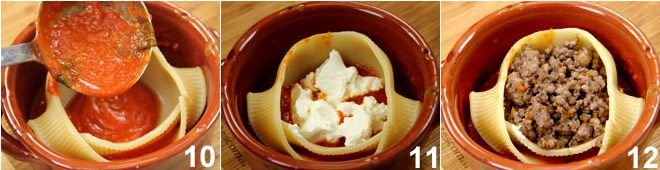 Place the caccavella on top, put a small ladle of tomato sauce inside 10, then 1.75 oz of crumbled ricotta 11 and a quarter of the ragù 12.