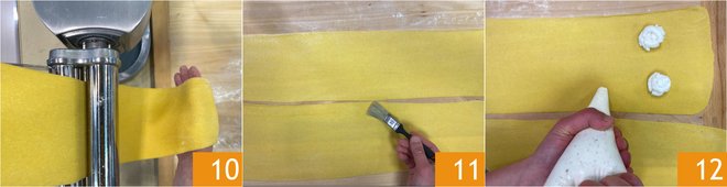 Take the dough again and roll out very thin sheets 10, up to about 1/25 inch thick. Brush the sheets with water 11 and fill them by neatly placing mounds of filling with the piping bag 12.