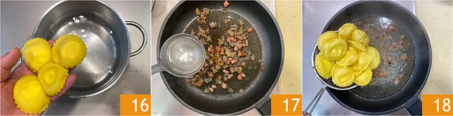 Cook the ravioli in plenty of salted boiling water 16. Meanwhile, transfer the guanciale to a non-stick pan and cook until crispy. When the ravioli are cooked, add a ladle of cooking water to the pan 17 and the drained ravioli 18, then let them flavor for a few minutes.