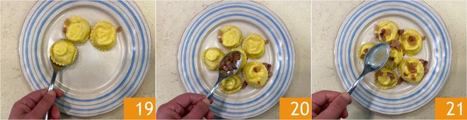 Plate 19 adding the guanciale 20 and a spoonful of cooking sauce 21.