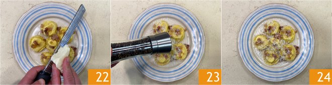 Finish with a sprinkle of Pecorino 22 and pepper 23. Cacio e pepe ravioli are ready to be served 24!