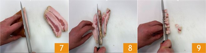 Cut the guanciale first into slices 7, then into strips 8, and finally into cubes 9 and set aside.