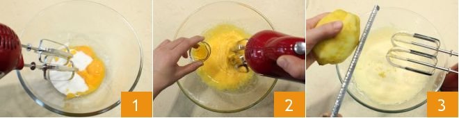 To prepare the cake in a jar, start with the lemon sponge cake. Separate the yolks from the egg whites and beat them with the electric whisks with 3 tbsps of sugar 1. Add the honey 2 and continue until they become pale and very frothy, and flavor with the lemon zest 3.