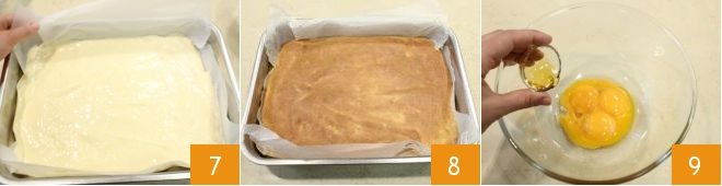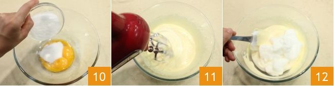 and half of the sugar 10. Beat the yolks until they become pale and very frothy 11. Also beat the egg whites to soft peaks with the remaining sugar, then gently combine the two mixtures with a spatula without deflating them 12.
