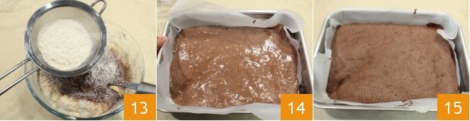 Add the sifted flour together with the cocoa powder 13 and mix the batter gently. Spread on a baking sheet of dimensions 14x11 inches lined with parchment paper 14. Bake in a preheated static oven at 375°F for 5 minutes. Remove the sponge cake from the oven 15 and let it cool.