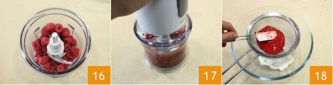 Meanwhile, prepare the cream: blend the raspberries in the mixer (16-17), sift the obtained sauce to remove the seeds and collect it in a bowl with the yogurt 18,