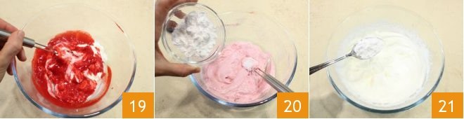 mix with the whisk to combine the ingredients 19 and then add half of the powdered sugar 20. Separately whip the fresh cream and add the other half of the powdered sugar 21.