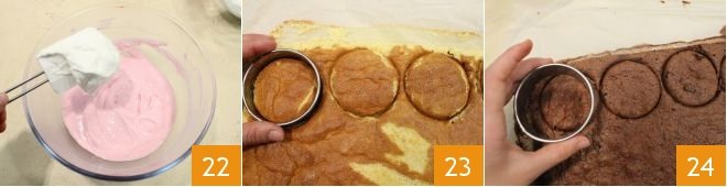 Fold the whipped cream into the raspberry cream and mix gently 22. Then take a cookie cutter with a diameter of 2.75 inches and cut out 4 discs from the lemon sponge cake 23 and 8 from the chocolate one 24.