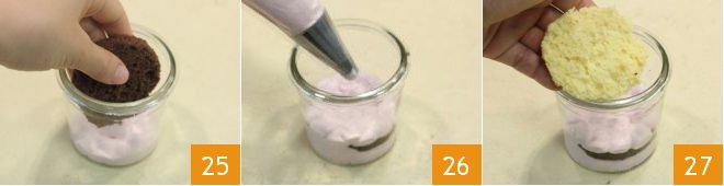To assemble the cake, use glass jars with a capacity of 7 oz: transfer the cream into a piping bag with a plain tip and form a layer of cream, then place a chocolate disc on top 25, then another layer of cream 26 and place another lemon sponge cake disc on top 27,