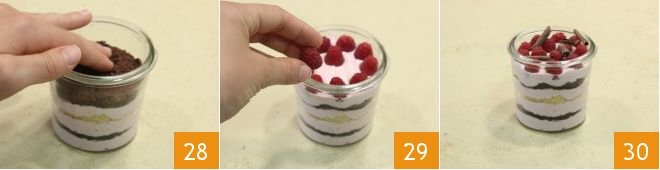 continue with another layer of cream, a cocoa sponge cake disc 28 and finish with cream, leaving 0.4 inches from the edge. Decorate with fresh raspberries 29 and dark chocolate curls 30. Your cake in a jar is thus ready to be enjoyed!