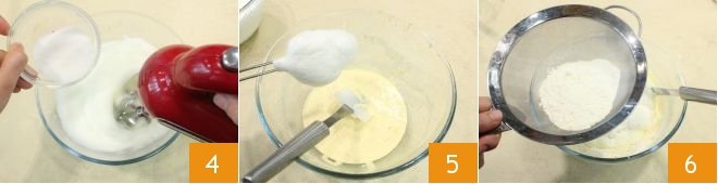 Beat the egg whites to soft peaks with the remaining sugar 4, so that no lumps form when you combine them with the other ingredients, then gently combine the two mixtures with a spatula without deflating them 5. Add the sifted flour 6 and mix it into the batter.
