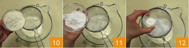 Then turn off the machine and sift the dry ingredients into the eggs: first the flour 10, then the potato starch 11, and finally the baking powder 12.