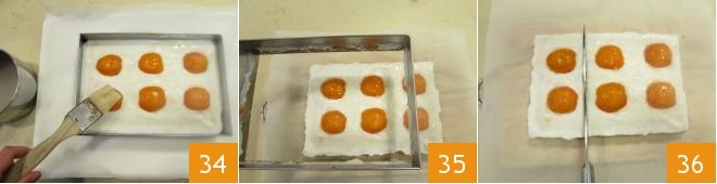 Let the jelly cool slightly and use it to brush the apricots 34. Let the dessert cool completely in the refrigerator, then remove the mold 35 and using a smooth-bladed knife, cut the cake 36