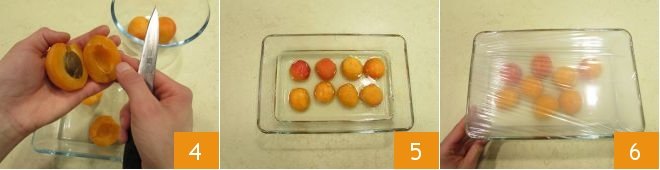 Wash the apricots, dry them, cut them in half, and remove the pit 4. At this point, place them in the syrup with the cut side down 5 and cover everything with plastic wrap 6. Place in the refrigerator and let them macerate overnight.