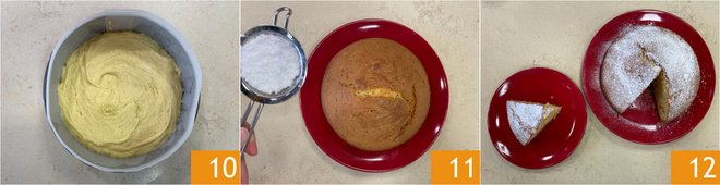 Level it 10 and bake in a static oven at 340°F for 30-35 minutes. Let it cool, remove from the mold, and decorate with powdered sugar 11. Your cake without yeast is ready to be enjoyed 12!