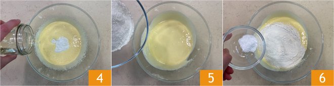 Continue with the vegetable oil 4, the flour 5, and the baking soda 6.