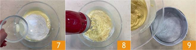 Finally, add the white wine vinegar 7. Beat with the mixer 8 until you obtain a homogeneous batter. Pour the batter into a 20 cm (8 inches) diameter mold 9 lined with parchment paper.