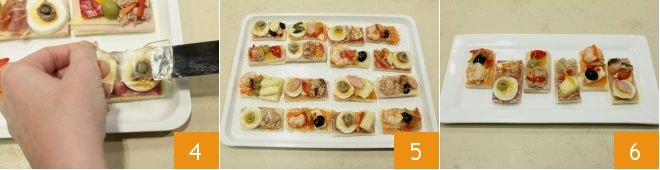 place the jelly rectangles on the canapés 4. Once done 5, put them in the refrigerator for 10-15 minutes before serving your jelly canapés 6.