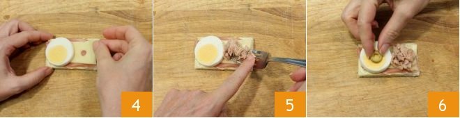 the brie, a slice of egg 4, and the previously drained tuna 5. Finish your prosciutto crudo canapés by adding a sliced green olive on the egg yolk 6.