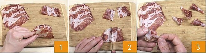 To prepare the capocollo cone stuffed on classic sheets, take the slices of capocollo (or coppa), fold them in half 2 and cut them into two equal parts 2, then form cones with each piece by wrapping the capocollo around itself 3.