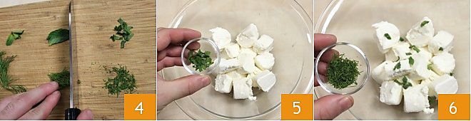 Separately, place the goat cheese in a bowl and finely chop the mint and dill with a knife 4, then add the aromatic herbs to the cheese (5-6). Mix well to blend all the ingredients, then salt and pepper to taste 7.