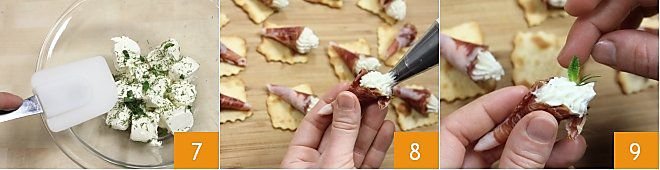 Transfer the mixture into a piping bag with a star tip, then fill each cone with the goat cheese herb cream 8. Place a cone on each sheet and garnish with a mint leaf and dill as shown in the photo 9. The capocollo cone stuffed on classic sheets is ready 9, we recommend serving and enjoying it immediately!