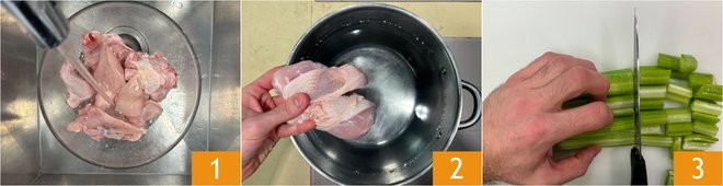 To prepare the capon broth, first rinse the meat under cold running water 1 to remove any impurities. Then place it in a large pot with the water 2 and bring to a boil over high heat. Meanwhile, prepare the vegetables. Cut the celery into pieces 3.