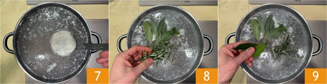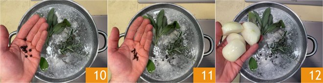 When the capon cooks, it releases foam, remove it gently with a ladle 7. Add the sage, rosemary 8, and bay leaves 9.